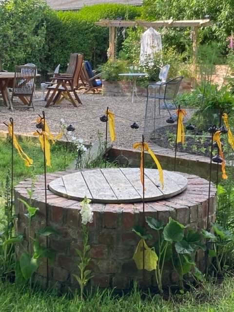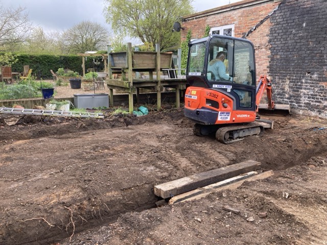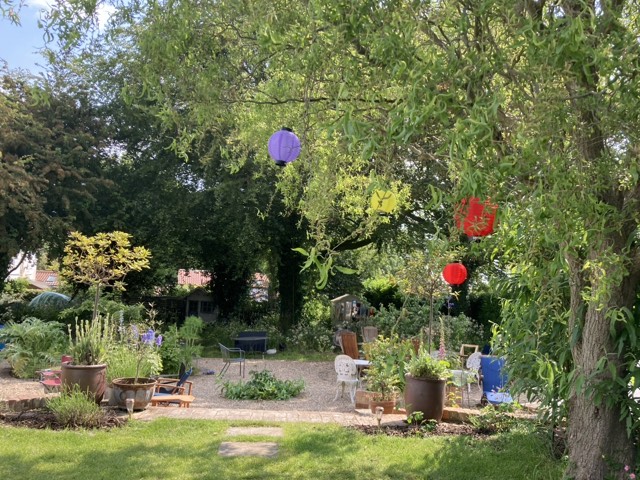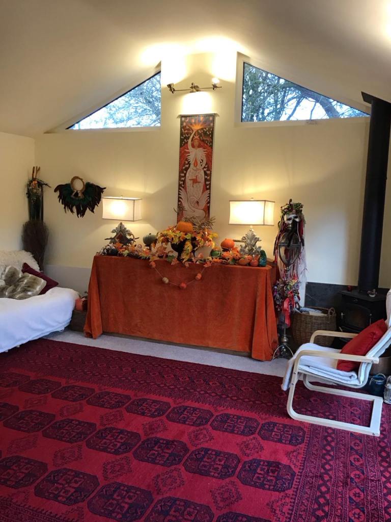 When we bought our house, it had a weatherbeaten old garage next to it made of corrugated iron and railway sleepers. It was suitably agricultural for a village setting but was threatening to fall down so in early 2023 we pushed it before it jumped. By the winter it had been totally rebuilt from the foundations upwards and is now a warm, cosy space with a practical craft workshop leading into a tranquil meditation, teaching/ritual space.